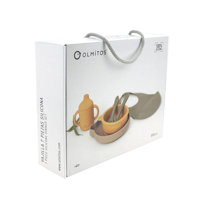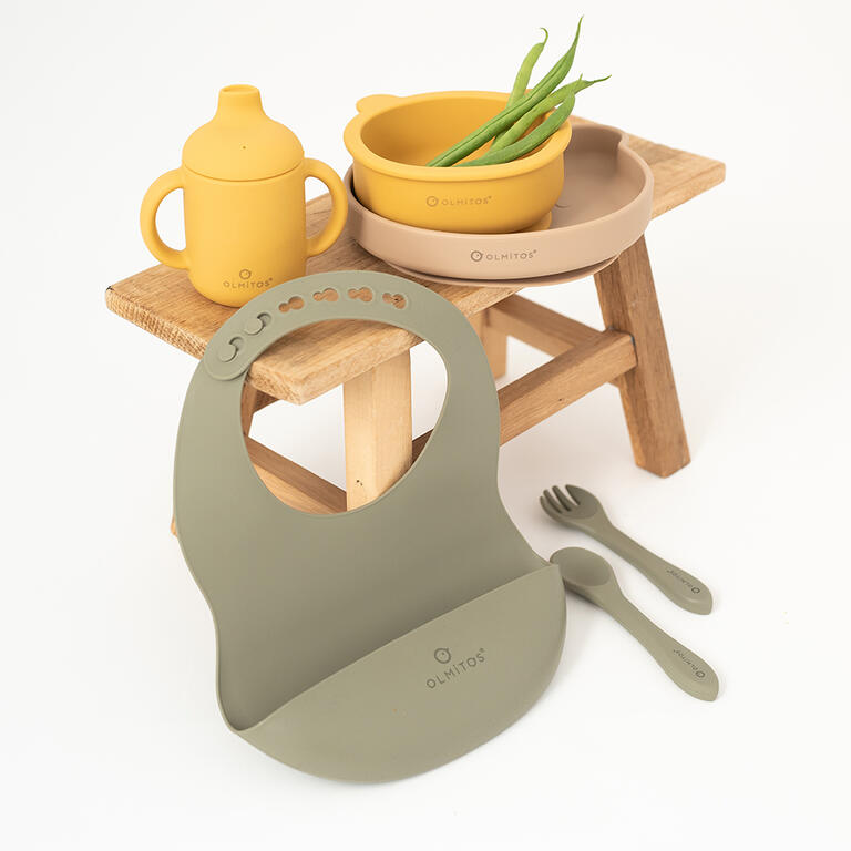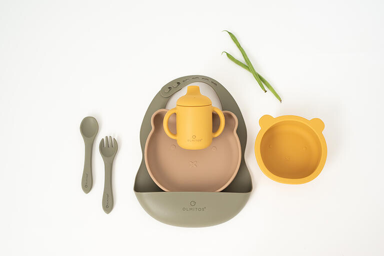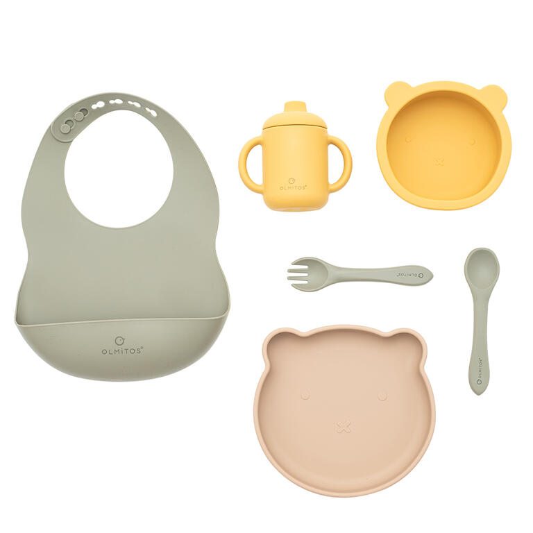 Vajilla completa infantil fabricada en silicona de grado alimenticio ideal cuando el bebé comienza a comer solo y durante sus primeros años. Es irrompible y duradero para el día a día.